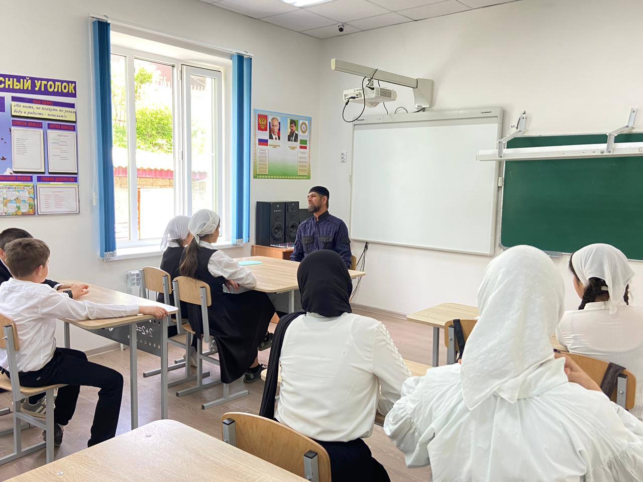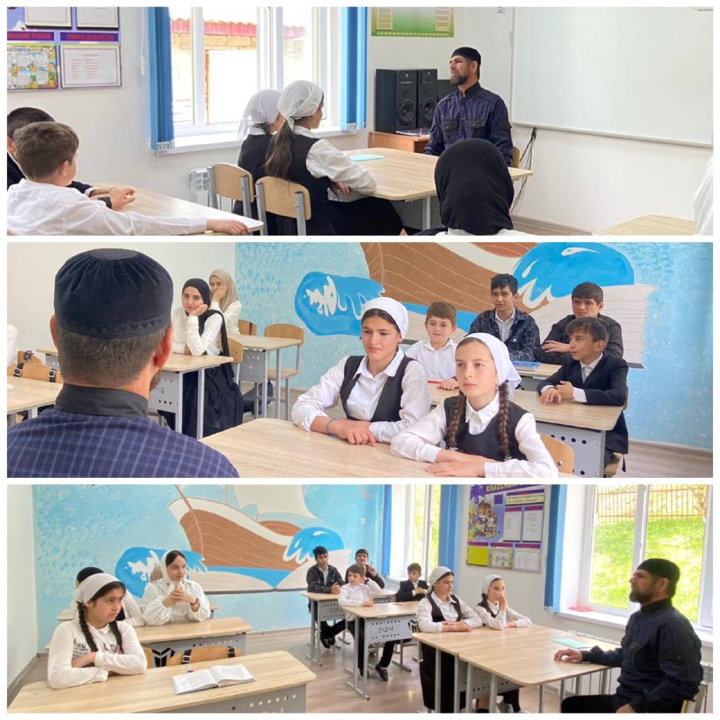 Сегодня, в рамках реализации Единой концепции духовно- нравственного воспитания и развития подрастающего поколения Чеченской Республики, педагог по духовно-нравственному воспитанию Сунчханов А.А. провел с учащимися беседу «Справедливость и милость всемогущего Аллах1а»