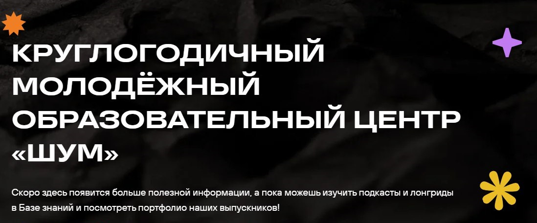 ШУМ.Эксперименты в медиа (14–17 лет). Смена направлена на освоение участниками базовых знаний и навыков из сферы медиа, профориентацию ребят от 14 до 17 лет по профессиям медиа сферы, формирование направлений для дальнейшего образовательного трека участника по сфере медиа, в том числе за счёт наставничества.