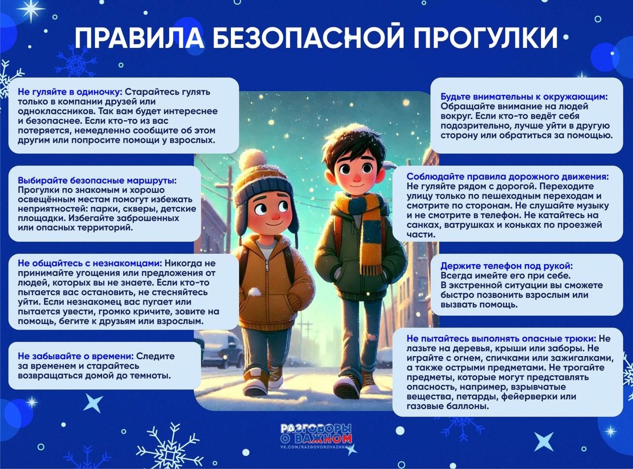 ДОРОГИЕ НАШИ ДЕТИ! Соблюдайте правила дорожного движения. Помните, что зимняя дорога опасна. Не играйте близи проезжей части дорог, ж/д полотна, водоёмах; не выходите на лёд.Помогайте младшим и старшим. Без разрешения родителей не уходите далеко от дома, и всегда предупреждайте родителей.Осторожно пользуйтесь газовой плитой, электроприборами, не оставляйте их без присмотра.Не используйте петарды, колющие, режущие взрывоопасные предметы - это опасно для твоего здоровья. Не засиживайтесь перед телевизором и компьютером. Читайте книги, посещайте кружки, занимайтесь дополнительно по школьным предметам.Больше гуляйте на свежем воздухе, встречайтесь с друзьями.Не общайтесь с незнакомыми людьми, не приглашайте их в дом. Не трогайте бесхозные сумки, пакеты или коробки.