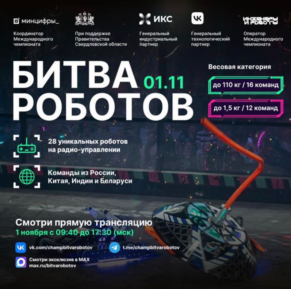 29.10.2025Минцифры России в соответствии с распоряжением Правительства Российской Федерации от 11 апреля 2023 г. № 889-р сообщает о проведении четвертого отборочного этапа Международного чемпионата по битве роботов сезона 2025 года (далее - Чемпионат, мероприятие). Цель Чемпионата - популяризация в Российской Федерации инженерной мысли как драйвера развития и поддержки современных цифровых технологий. Три отборочных этапа Чемпионата прошли на территории Пермского края, Московской и Ленинградской областей, в которых приняли участие 84 команды со всего мира, из них только 24 команды встретятся в финальном этапе, чтобы побороться за титул чемпиона битвы роботов 2025 года. На текущий момент прямую трансляцию этапов посмотрели более 14 млн человек, свыше 18 тыс. человек посетили отборочные этапы. В четвертом отборочном этапе Чемпионата сразятся 28 команд из России, Беларуси, Индии и Китая: 16 команд в рамках дисциплины «Битва роботов» в весовой категории до 110 килограмм и 12 команд в рамках дисциплины «Битва мини-роботов» в весовой категории до 1,5 килограмм. Среди участников - команды МТУСИ, СПбГУТ им. М.А. Бонч-Бруевича, Высшей Школы Нефти, МИСИС, ИТМО, СПбПУ Петра Великого, ДГТУ, МИРЭА, НГТУ НЭТИ и других ведущих университетов. Мероприятие пройдет 1 ноября 2025 г. с 11:30 до 19:30 (по местному времени) при поддержке Правительства Свердловской области на территории Международного выставочного центра «Екатеринбург-ЭКСПО» по адресу: Свердловская область, г. Екатеринбург, ЭКСПО-бульвар, д. 2. Программой мероприятия предусмотрено два шоу: дневное (с 13:00 до 14:30) и вечернее (с 18:00 до 19:30). 2 С учетом высокой социальной значимости Чемпионата и его международного статуса просим оказать информационную поддержку Чемпионату на доступных ресурсах региона, а также разместить баннер со ссылкой на прямую трансляцию Чемпионата в сети «Интернет» по адресу https://vkvideo.ru/video-219465931_456240970 в информационных системах, используемых в учебном процессе в образовательных организациях.